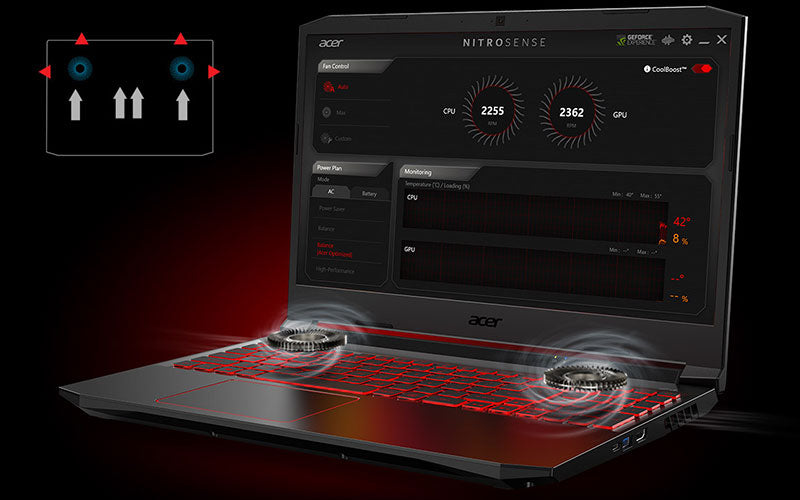 Afin d’offrir des performances optimales à tout instant, ce PC portable Gamer bénéficie d’un système de refroidissement efficace : deux ventilateurs, la technologie Acer CoolBoost et une conception à quatre fentes d’aération. La technologie CoolBoost augmente la vitesse des ventilateurs de 10 % et le refroidissement de votre puce graphique et de votre processeur de 9 % par rapport au mode automatique. De plus, vous pouvez surveiller et gérer votre système en temps réel avec NitroSense, qui contrôle la température, la vitesse des ventilateurs et plus encore.