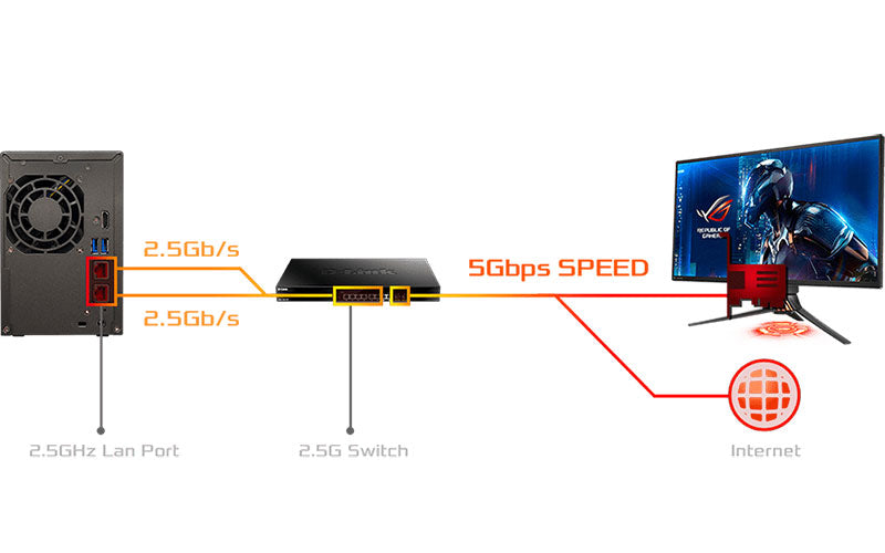 La série de NAS AS66 comprend deux ports Ethernet Intel 2.5 Gigabit. Obtenez des performances jusqu’à 150% supérieures à celles du Gigabit Ethernet avec du matériel compatible et jusqu’à 5 Gbps en utilisant l’agrégation de liens.