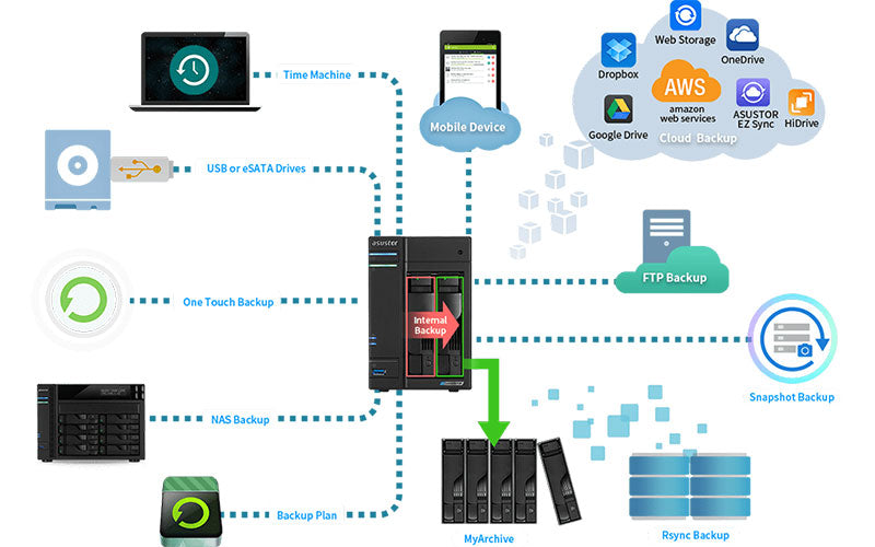 La solution de sauvegarde complète d’ASUSTOR propose plus de douze options de sauvegardes différentes, notamment Amazon S3, Dropbox, Google Drive et Onedrive. Backup Plan d’ASUSTOR pour Windows ainsi que Time Machine pour macOS offrent des sauvegardes faciles pour les ordinateurs de bureau et les ordinateurs portables, tandis que les disques durs amovibles MyArchive fournissent un stockage à froid.