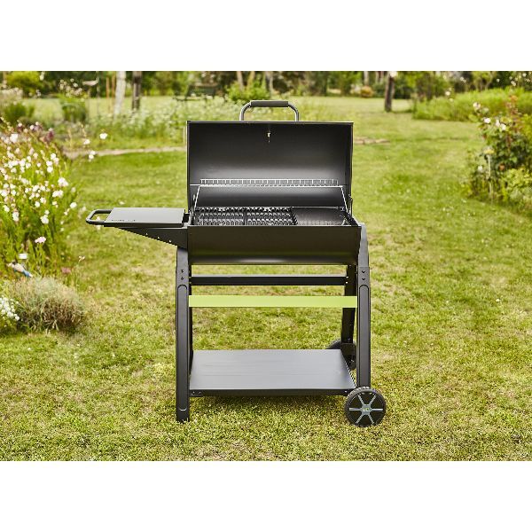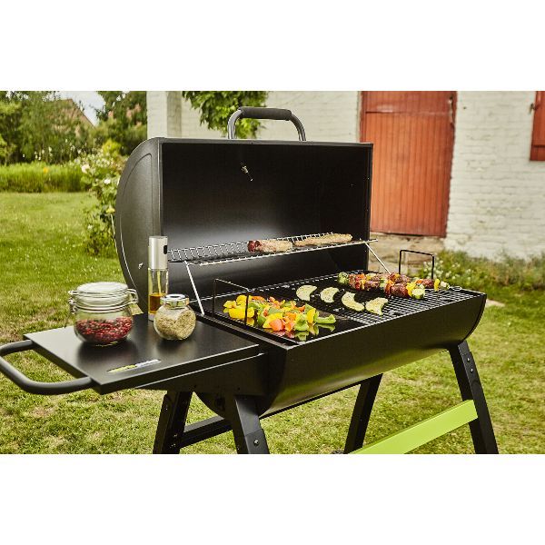 Barbecue charbon Tonino 70 – Idéal pour régaler jusqu’à 10 personnes ! Polyvalent, ce barbecue possède un espace gril et un espace plancha (2/3 grille et 1/3 plancha – Surface de cuisson : 68 x 41,5 cm) – Tablette latérale et grille de maintien au chaud au dessus de la partie cuisson – Capot avec thermomètre intégré pour une cuisson à l’étouffée – Cuve en acier peint avec système de ventilation – Panier de combustion réglable en hauteur – Hauteur de cuisson : 82 cm – Coloris noir – Garantie 2 ans – A monter soi-même.