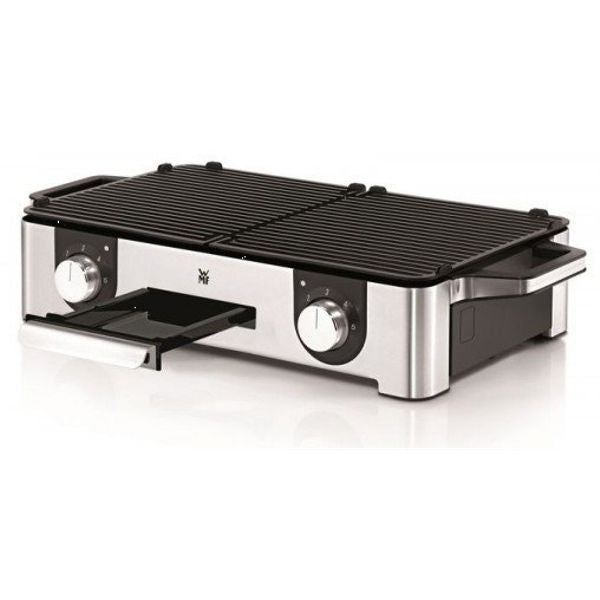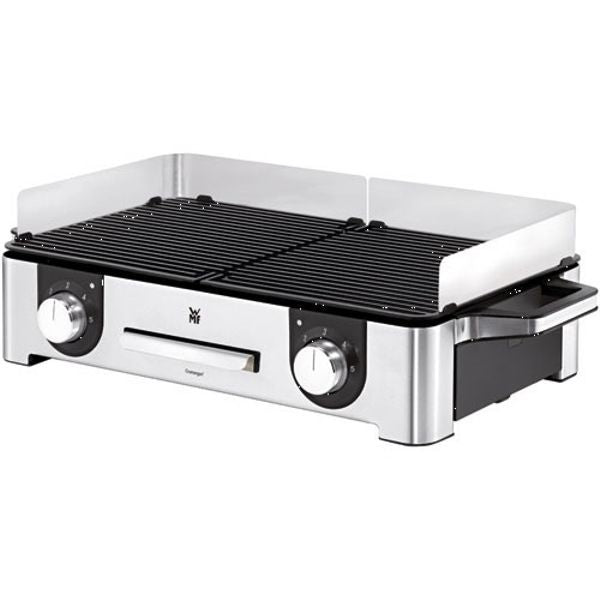 Master Grill – Lono – Un grill performant pour le plaisir des barbecues à la maison en intérieur mais aussi à l’extérieur ! – Surface de grill 50 x 28 cm offrant une large surface pour préparer vos plats grillés pour vos invités – 2 zones de cuisson avec réglage de la température indépendants – Thermostat réglable 5 positions avec éclairage LED – 2 plaques extra-épaisses nervurées en fonte d’aluminium avec revêtement anti-adhérent et éléments chauffants intégrés – Bac récupérateur à graisses et jus amovible – Pare-vent amovible pour protéger du vent et des éclaboussures – Nettoyage facile : les plaques de cuisson amovibles passent au lave-vaisselle – En Cromargan® mat – Dimensions 50 x 28 x 18 cm – Puissance 2400 W – Garantie 2 ans.