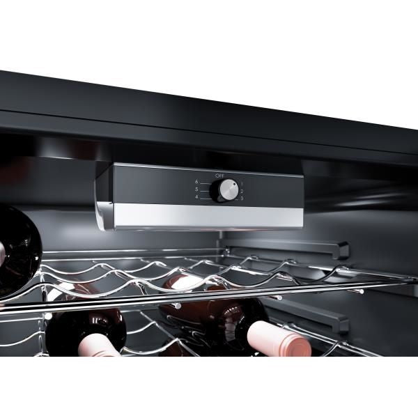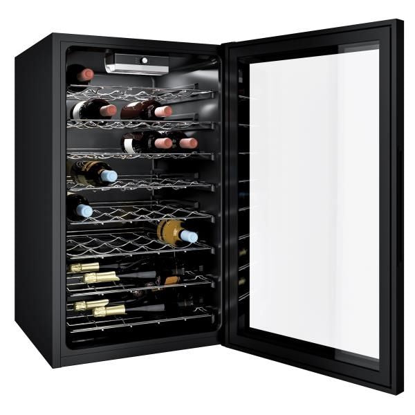 Cave à vin Mise en température – Température réglable de 7 à 18°C – Eclairage LED – 8 clayettes en métal chromé – Commande mécanique interne – Porte verre – Poignée intégrée – Finition noire.