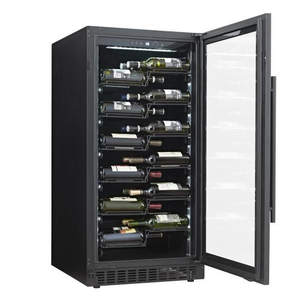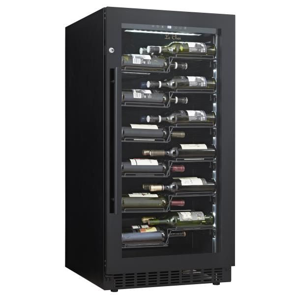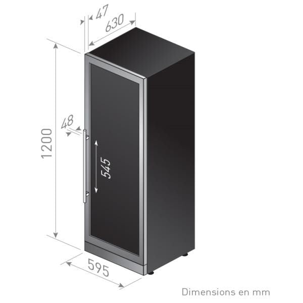 Cave à vin (Mise en température) – Température réglable de 5 à 20°C – Froid ventilé – Filtre à charbon – Gestion électronique des températures avec affichage LED – Système anti-vibrations – Système unique de clayettes sur glissières – Eclairage intérieur LED blanche sur les côtés – Porte triple vitrage traité anti-UV avec entourage noir (non réversible) – Serrure – Finition noire – Installation Pose-libre ou enchassable.