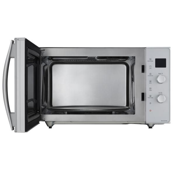 Micro-ondes gril + Chaleur tournante 1300W (100-220°C) – Commande digital mécanique par bouton Pop-Up – 11 programmes – Guide Auto – 3 touches Décongélation Auto – Fonctions Décongélation Express, Réchauffage Express et Mémoire – Gril Quartz avec 3 réglages – Livré avec plat croustilleur PanaCrunch – Technologie Inverter garantissant une cuisson constante et uniforme des aliments – Plateau tournant Ø 34 cm – Cavité inox – Sécurité enfants – Slim-Compact : 20% d’encombrement en moins – Finition silver.