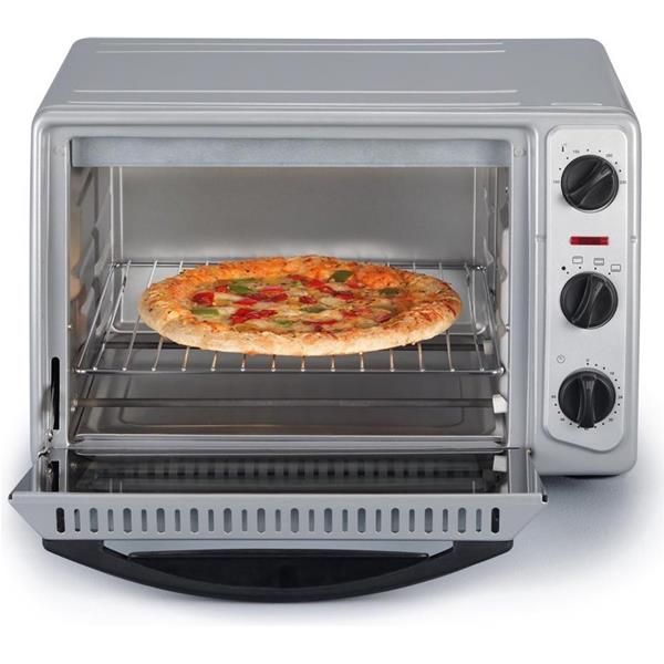 Mini-four mécanique 20 L – 2045 – Corps laqué résistant à la chaleur – Interrupteur 4 positions : arrêt / résistance de voûte / résistance de sol / résistances de voûtes et de sol – Minuterie 60 minutes avec signal sonore – Thermostat réglable de 100 à 230°C – Voyant lumineux de contrôle – Livré avec une grille et un plat de cuisson 28 x 28 cm – Position du plat de cuisson ou de la grille réglable sur 3 positions – Idéal pour les cuisson des pizzas jusqu’à 28 cm de diamètre – Plat ramasse-miette amovible – Dimensions extérieures 45.2 x 40.2 x 28.7 cm – Coloris argent – Puissance 1500 W – Garantie 2 ans.