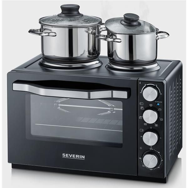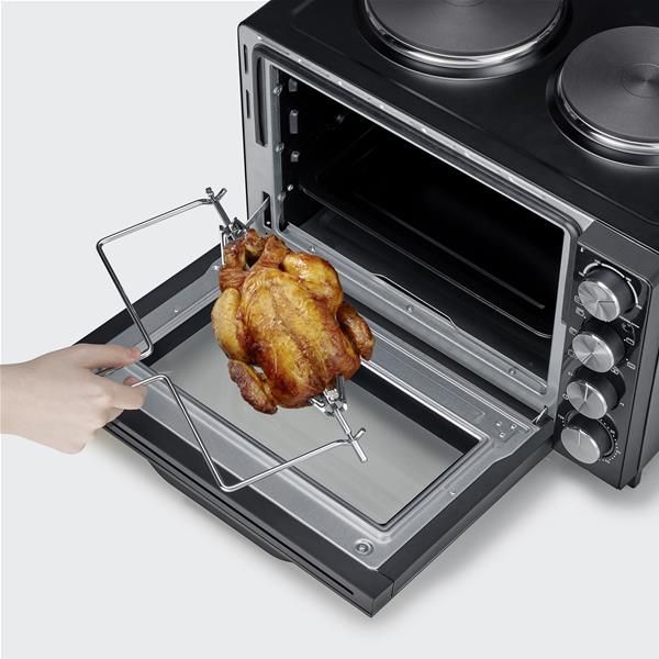 Mini-four 30 L + 2 plaques de cuisson – Un mini-four compact et pratique : idéal pour les étudiants en studio ! – Interrupteur 7 positions : Arrêt / Résistance de voûte / Résistances de voûte et de sol / Résistances de voûte et de sol en chaleur tournante / Résistances de voûte avec tournebroche / 2 niveaux de température pour la grande plaque de cuisson – Programmation mécanique – Température réglable entre 100 et 230°C – Plaques de cuisson (15,5 et 18,5 cm) avec puissance de 1000 W et 1500 W – Cuisson simultanée du four avec la petite plaque de cuisson – Tournebroche – Minuterie 120 minutes avec arrêt automatique et signal sonore – Éclairage intérieur et revêtement antiadhésif de haute qualité pour un nettoyage facile – Isolation thermique et façade en verre de grande qualité – 3 hauteurs de grille – Voyant lumineux de contrôle – Livré avec un tournebroche de 30 cm, une grille 27.5 x 34.5 cm, une plaque de cuisson 31 x 24 cm, un ramasse-miettes et 2 poignées d’extraction – Coloris Noir – Dimensions 50 x 41.5 x 35 cm – Puissance du four 1500 W – Puissance totale 2500 W – Garantie 2 ans.