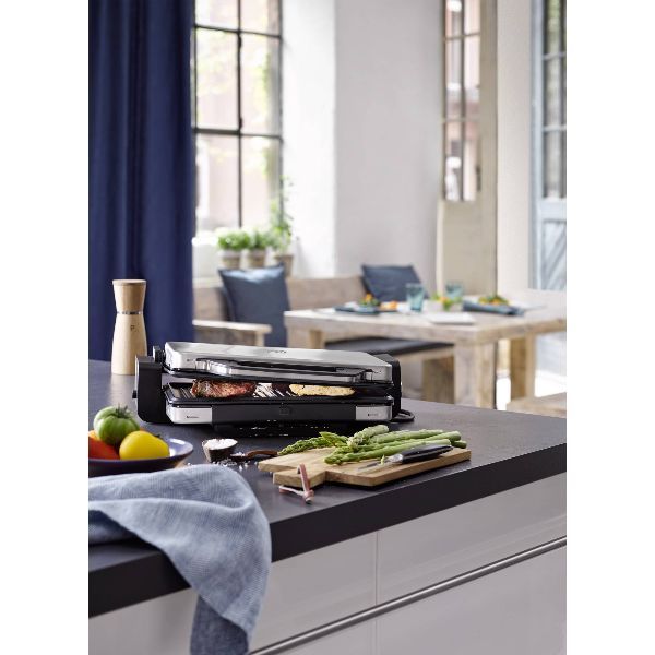Grill Contact 2 en 1 – Lono – Ce grill 2 en 1 peut être utilisé à la fois comme grill contact (fermé) et comme grande plancha de table lorsqu’il est déplié (ouvert) – La plaque de grill Vario-Flex est unique et s’adapte idéalement à l’épaisseur des différents aliments – Des côtes de porc et des légumes peuvent être cuits en même temps : la plaque de cuisson est fixée de manière si flexible qu’elle est toujours en contact avec les aliments – Votre repas familial sera toujours un succès, tout en étant peu gras et sain ! – Plaques grill en aluminium moulé avec revêtement antiadhésif résistant aux rayures – Thermostat réglable – Bac récepteur de graisse et jus – Rangement vertical pour un gain de place – Finition Cromargan® mat – Puissance 2100 W – Garantie 2 ans.