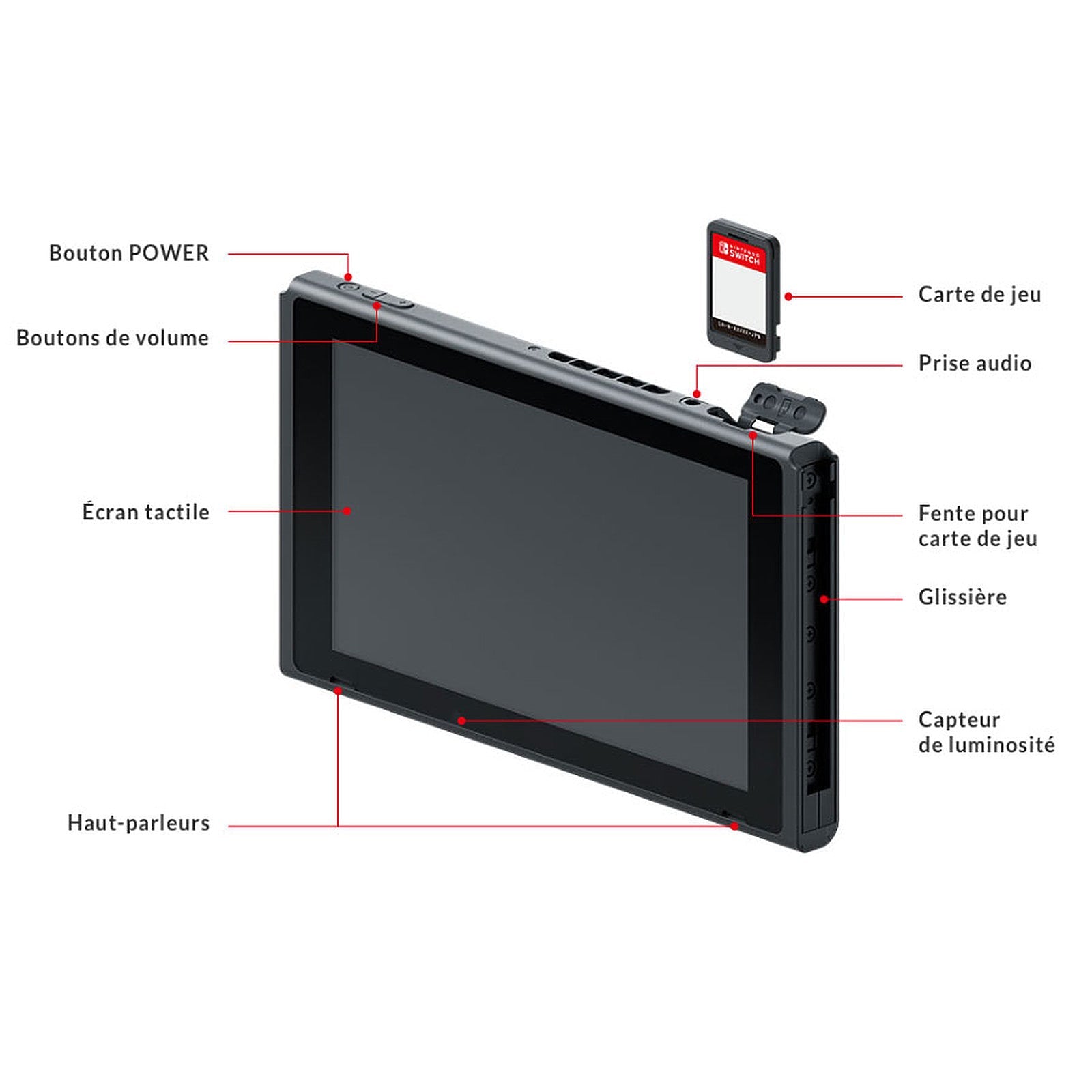 • Contenu de la boite : console, station d’accueil, Joy-Con, support Joy-Con, deux dragonnes, câble HDMI, adaptateur secteur Nintendo Switch