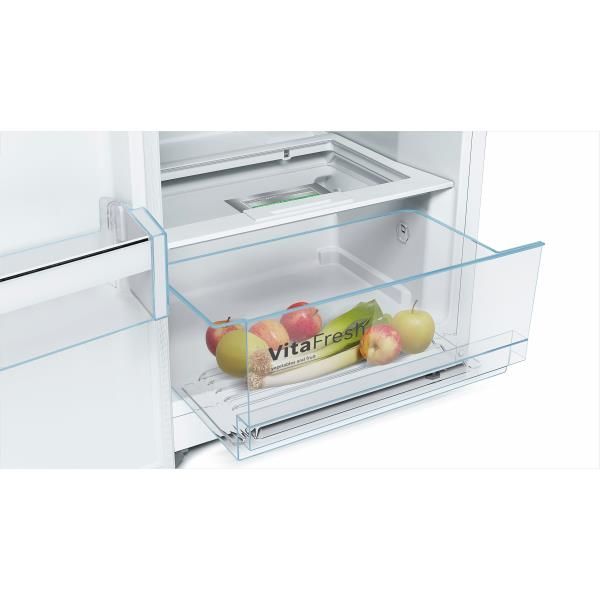 Réfrigérateur 1 porte Tout utile – Ligne série 4 – Dégivrage automatique – Froid brassé – Fonction Super Réfrigération avec arrêt automatique – Clayette porte-bouteilles – 6 clayettes verre dont 5 coulissantes EasyAccess – Compartiment VitaFresh fruits et légumes avec contrôle d’humidité – Eclairage LED – Régulation électronique de la température avec indicateur LED – Poignée verticale – Ouverture de porte à 90° sans débord.