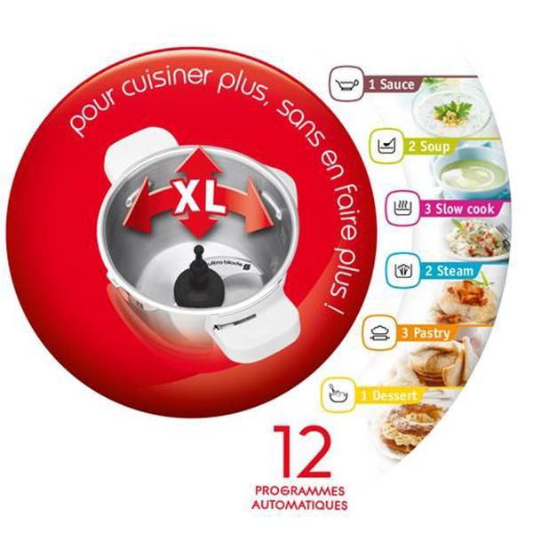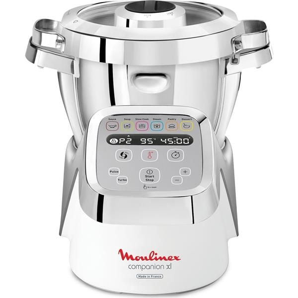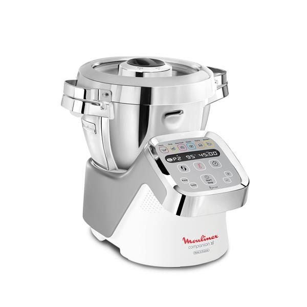 Robot cuiseur CUISINE COMPANION XL avec son bol XL de 4.5 litres (3 litres utiles) – Pour cuisiner plus sans en faire plus ! – Plus besoin de rester des heures en cuisine : Companion XL s’occupe de tout ! – En seulement quelques clics, ce robot cuiseur multifonctions prépare une immense variété de recettes pour régaler toute la famille (jusqu’à 10 personnes) grâce à ses 12 programmes et sous-programmes automatiques, ses 6 accessoires dédiés et un bol très grande capacité de 3 L (capacité utile) – Il découpe, prépare et cuit, et garde même votre recette au chaud jusqu’à l’heure du repas ! – 12 programmes (sauce, soupe, mijoté, vapeur, pâtisserie, dessert…) et sous-programmes automatiques – Vous pouvez également créer vos propres recettes en mode Manuel pour cuire, mijoter, cuire à la vapeur, rissoler, saisir, dorer, mélanger, pétrir – Interface simple et intuitive à partir de l’écran tactile – Livré avec 6 accessoires dédiés : couteau hachoir, batteur, mélangeur, couteau dentelé pour pétrir, panier vapeur 2 L, bouchon vapeur – Accessoire fond plat – Mode cuisson couvercle ouvert pour un dorage optimal – 12 vitesses + Mode Pulse + Turbo – Large choix de réglage de la température de 30° à 150°C par palier de 5°C pour réchauffer, cuire, saisir ou rissoler – Réglage du temps de 5 secondes à 120 minutes – Couvercle en verre et métal – Bol avec inserts métal et poignées rivetées – Spatule, boîte de rangement – Coloris Silver – Puissance 1550 W – Garantie 2 ans.
